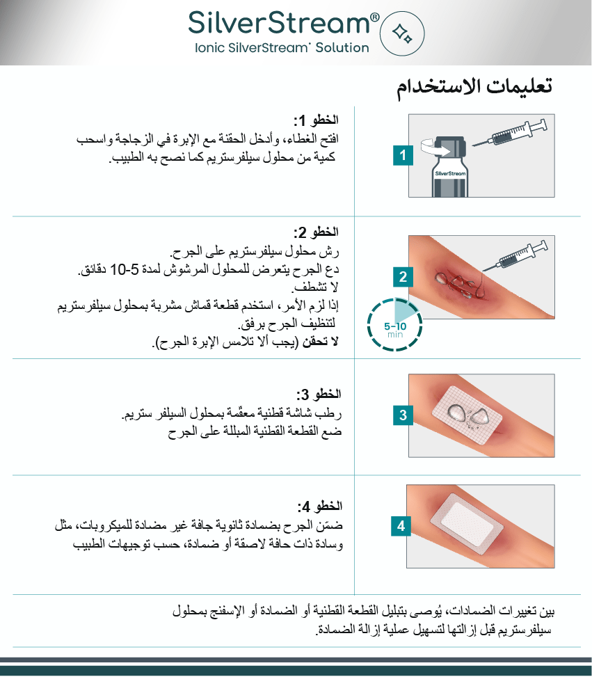 | قم بتبليل قطعة قماش قطنية نظيفة بمحلول سيلفرستريم وضع القطعة القطنية المبللة على الجرح وفقًا لتعليمات الطبيب | .3 |